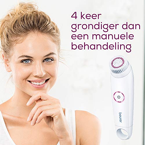 De Beurer FC 45 gezichtsborstel voor een voelbaar zachte en stralende huid Deze elektrische gezichtsborstel biedt een milde reiniging waarmee de doorbloeding gestimuleerd en verbeterd kan worden. Bij een regelmatige behandeling zal uw gezichtshuid er zichtbaar helderder en stralender uitzien, omdat deze reinigingsmethode tot 4 keer grondiger is dan een manuele behandeling. Daarbij is de gezichtsborstel geschikt voor elk huidtype, zelfs een gevoelige huid. De belangrijkste eigenschappen in één oogopslag: – Met cirkelvormige rotatie voor een zeer milde reiniging – Waterbestendige IPX-7: voor gebruik onder de douche of in bad – Incl. 1-minutentimer – Verlichte AAN/UIT-schakelaar – 2 snelheidsstanden – Werkt op batterijen – batterijweergave wanneer de batterijen leeg zijn De gezichtsborstel wordt geleverd met een borstelkop: voor elk huidtype. De borstel ligt met een afmeting van 16 x 4,5 x 4,5 cm en een gewicht van ca. 94 g (zonder batterij) perfect in de hand. Het waterbestendige gezichtsreinigingsapparaat kan zelfs onder de douche of in bad worden gebruikt. Met praktische huidzonetimer De praktische 1-minutentimer is geschikt voor een grondige reiniging van het hele gezicht. Voor de ideale reiniging van het gezicht moet u om de 20 seconden naar een ander gezichtsdeel wisselen.
